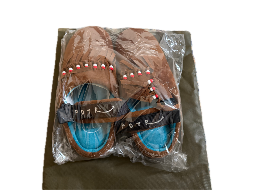 ネイティブアメリカンの一枚革モカシンをモチーフに、フリンジや刺繍、ビーズを盛り込んだデザインはかなり個性的です。
